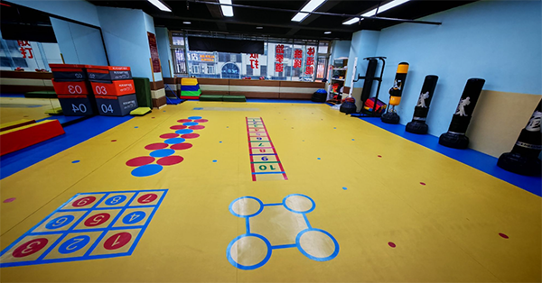 场馆面积 800 ㎡,设跆拳道垫区、散打擂台、拳击沙袋区、力量房及更衣室。