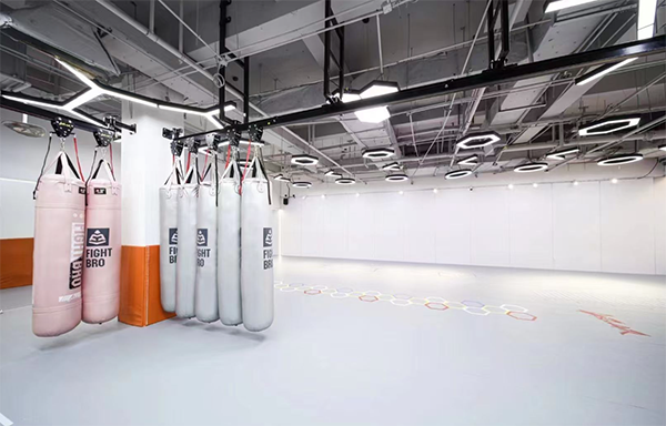器械区:配备沙袋、护具、跳绳、哑铃、杠铃等,满足不同课程需求。